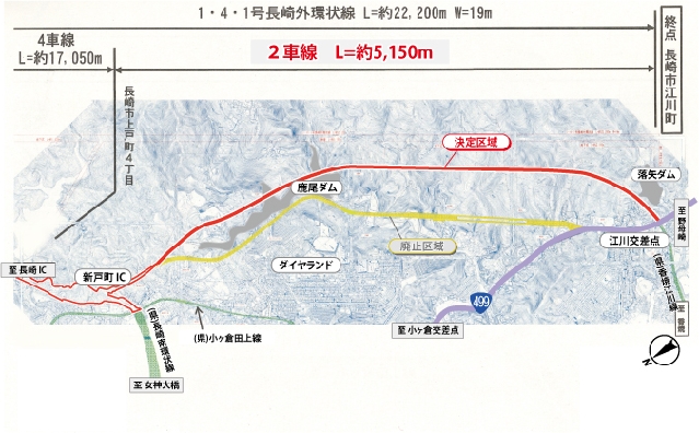 長崎都市計画(1・4・1号 長崎外環状線)は、長崎都心部の渋滞緩和を目的に1975年に都市計画決定された。今回、新戸町インターチェンジから柳田町間の事業化に当たり、事業主体である県が、接続する国道499号の慢性的な渋滞緩和や主要渋滞地点である小ケ倉交差点・柳田交差点の負荷軽減に効果的なルートを再検討。終点の位置を江川交差点に移した。併せて、走行性や施工性(工事用道路の確保など)、コスト面を考慮し、鹿尾ダムの西側から東側を通るルートに変更した。この結果、起点である時津町元村郷から終点までの延長は2万1500bから2万2200bに延長する。また今回変更する上戸町4丁目から終点までの5150bの区間については、交通量推計の結果を踏まえ4車線から2車線(幅員10b、車道3・25b×2)に縮小することにした。このうち鹿尾町から終点付近の江川町までの山地部は、延長約2160bのトンネル構造(幅員8b)を計画している。